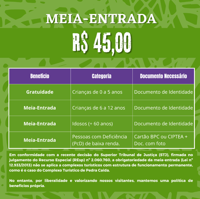 Taxa Complexo Pedra Caída: R$ 100,00 por pessoa